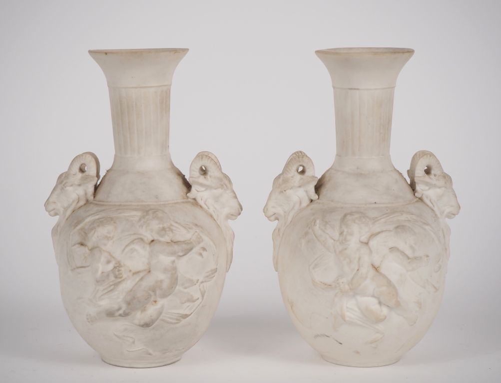 Paire de vases en biscuit de style Louis XVI à décor d'amours et de boucs. H. 18 cm