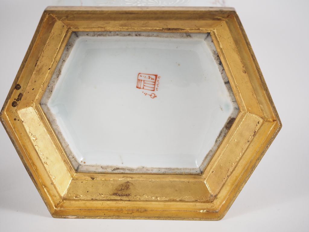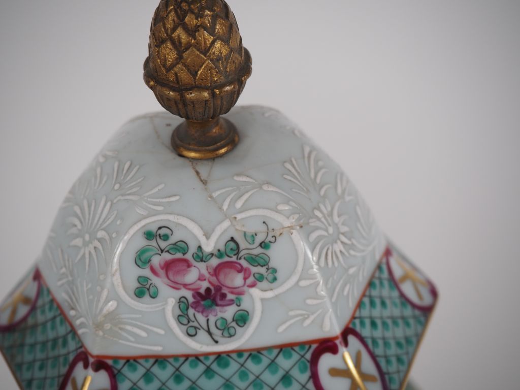 SAMSON. Paire de vases couverts en porcelaine polychrome dans le style de la compagnie des Indes, famille rose. Monture en bronze doré. H. 44 cm (un couvercle accidenté et recollé.)