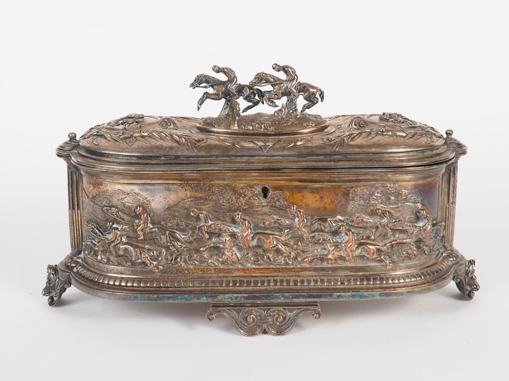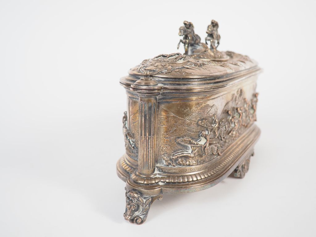 Coffret à bijoux en métal argenté à décor en relief de cavaliers et de palmes. Dim. 17 x 27,5 x 9 cm.