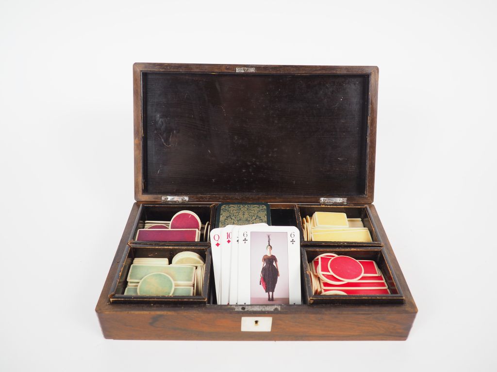 Coffret à jeux début XXème en marqueterie de nacre, avec cartes et jetons. Dim. 6 x 27 x 15 cm.