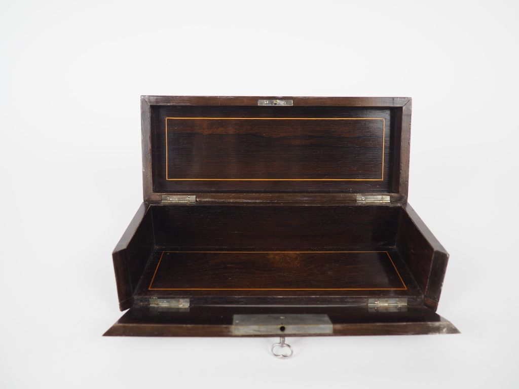 Coffret Napoléon III en marqueterie à décor de cygne nageant dans une vasque. Dim. 9 x 27 x 11 cm.