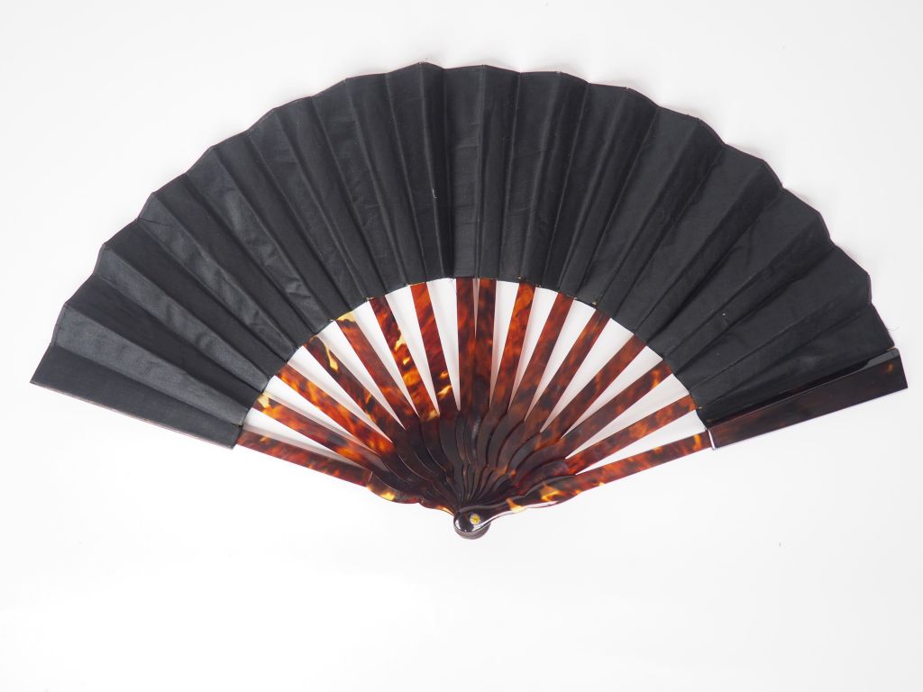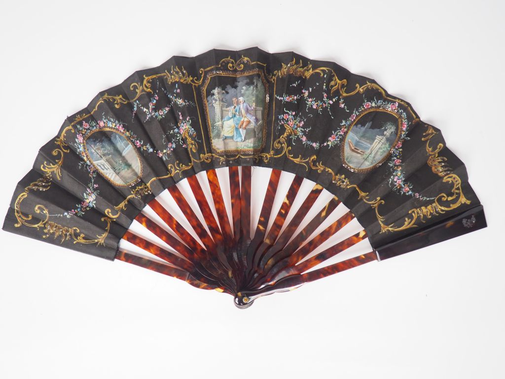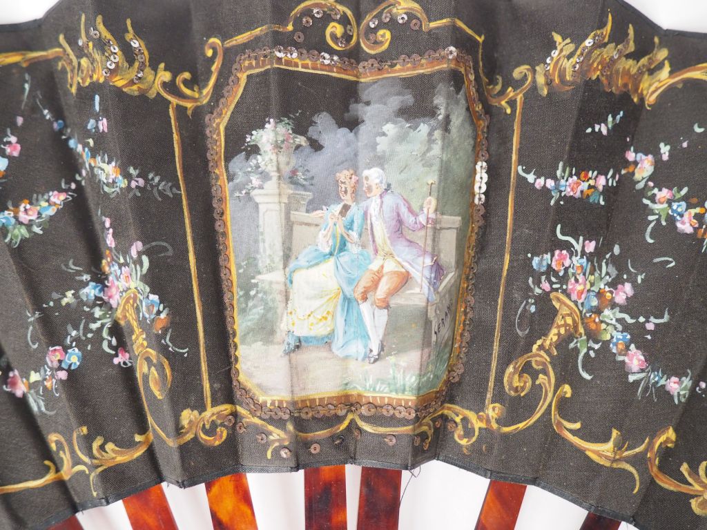 Eventail fin XIXème - début Xxème en écaille à décor dans des réserves d'une scène galante, 16 brins. L. 24,5 cm. (Usures)/