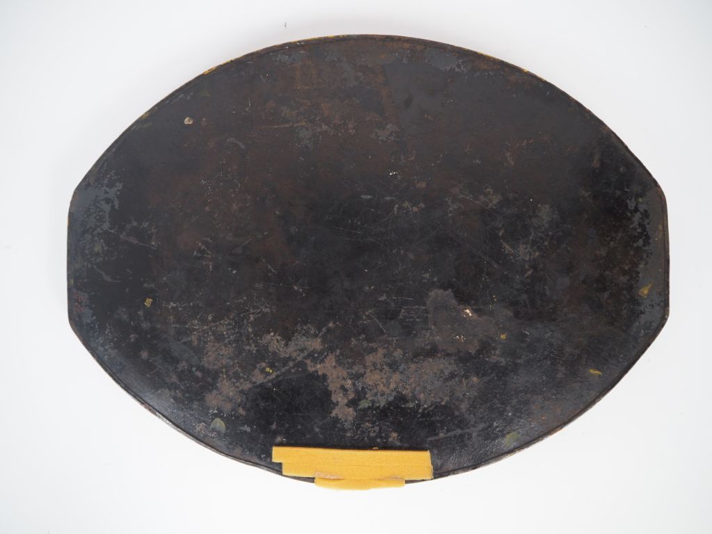 Plateau ovale de style Directoire à décor en grisaille sur fond jaune, "enfants devant une chaumière". Dim. 54 x 41 cm. (oxydation)