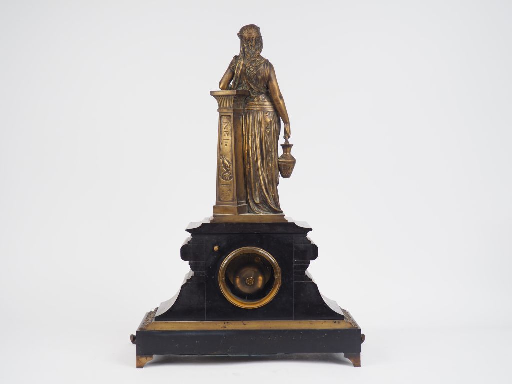 Pendule XIXème en marbre noir surmontée d'une scultpure en bronze 'La porteuse d'eau' signée Bourret. Dim. : 62 x 47 cm.