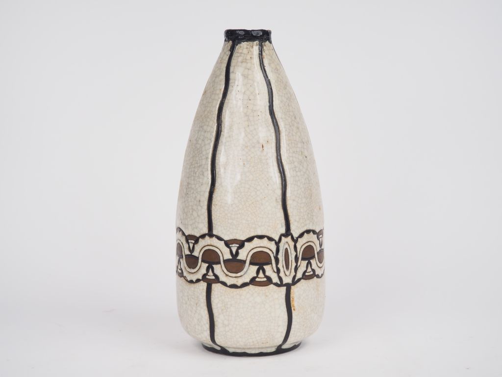 BOCH LA LOUVIERE. Vase ovoïde Art Déco en faïence craquelée à décor de motifs géométriques bruns et de liserés dorés. H. 28 cm.