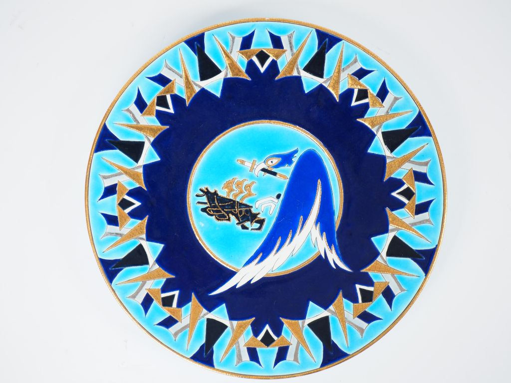 LONGWY Grand plat Art déco en émaux polychromes à décor d'aigle et de glaive. Signé. Diam. 37,5 cm