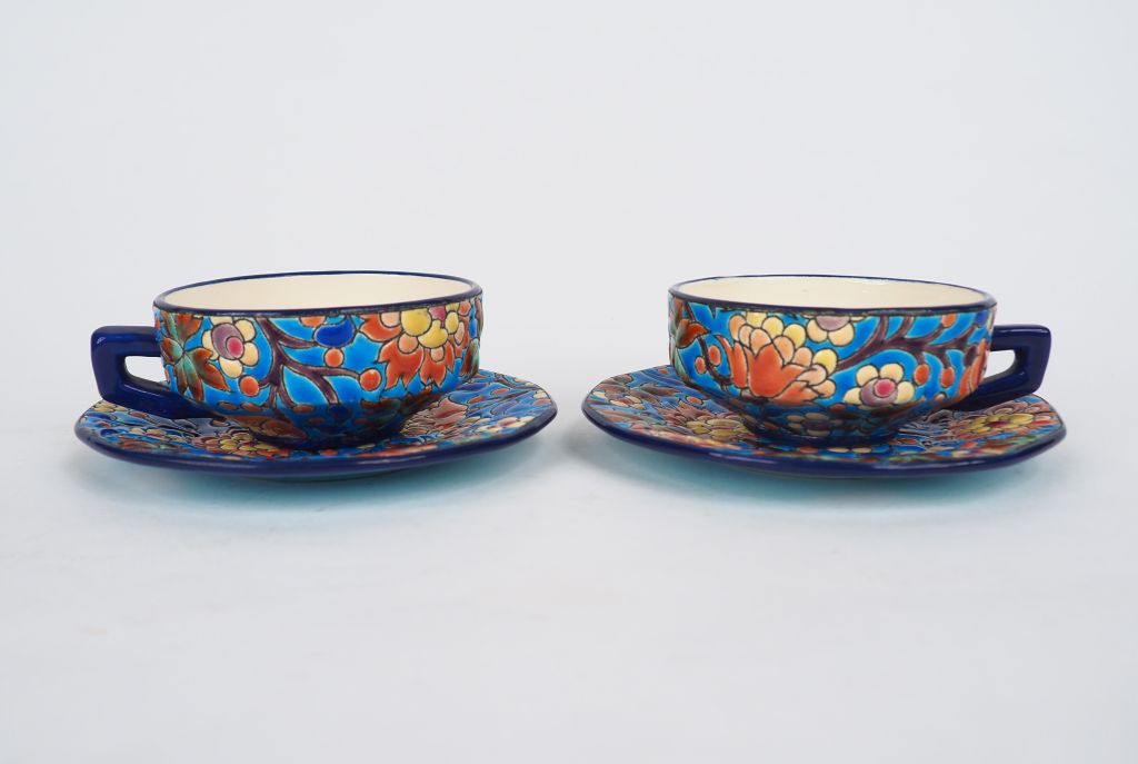 LONGWY. Paire de tasses et sous tasses en émaux polychromes à décor d...