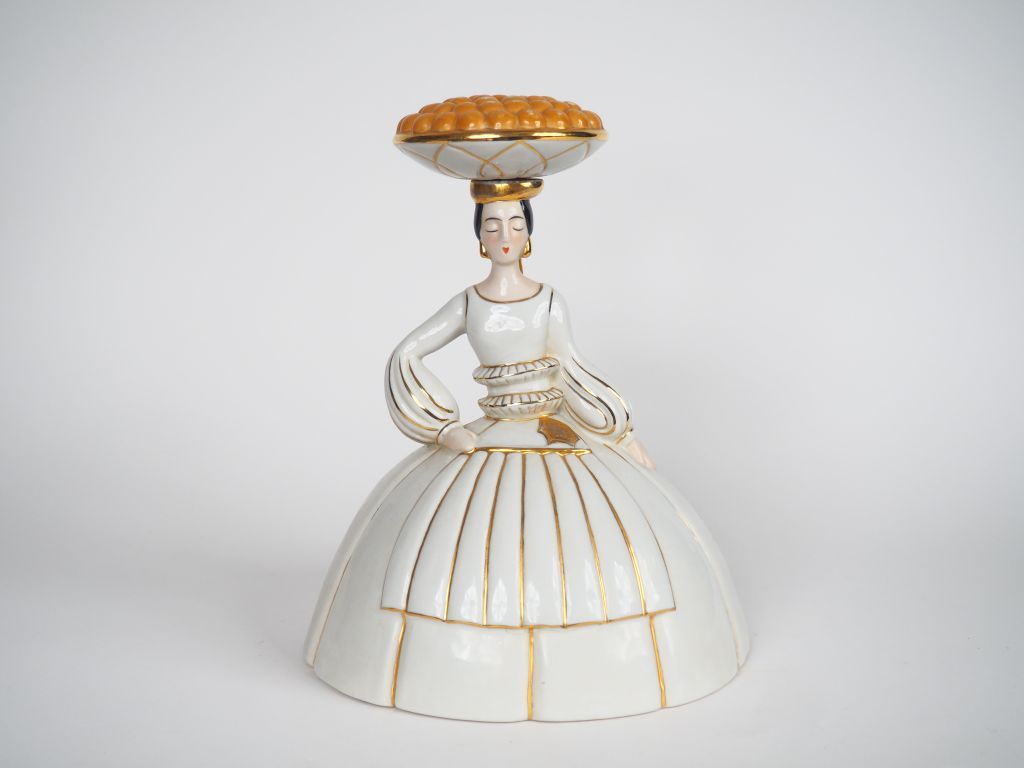 ROBJ. Bouteille à liqueur en porcelaine polychrome "porteuse d'oranges". Signée. H. 28,5 cm (Manque de polychromie).