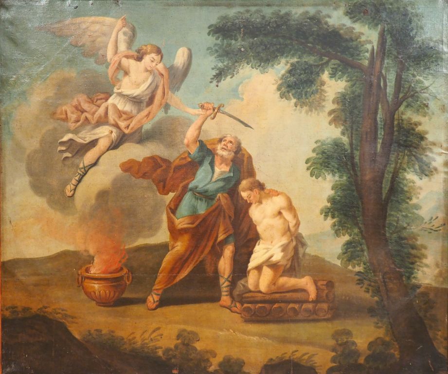 Ecole française XVIIIème. "Le sacrifice d'Isaac". Huile sur toile. Dim. 115 x 137 cm. (Petits accidents et restaurations).