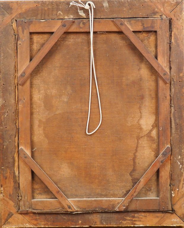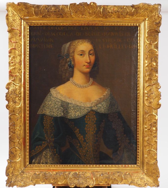 Ecole française XVIIIème, suiveur de Ducayer. 'Portrait de dame au collier de perles et à la robe de soie bleue'. Huile sur toile. Dans son cadre en bois doré d’époque, à décor de fleurs et de palmettes. Dim. : 81 x 64 cm.