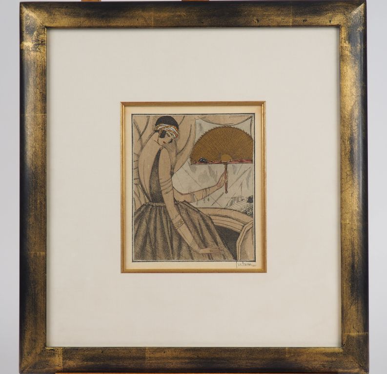 Georges LEPAPE "Femme à l'éventail dans une loge" Plume et aquarelle. Signée en bas à droite et datée 1920. 18,5 x 15 cm