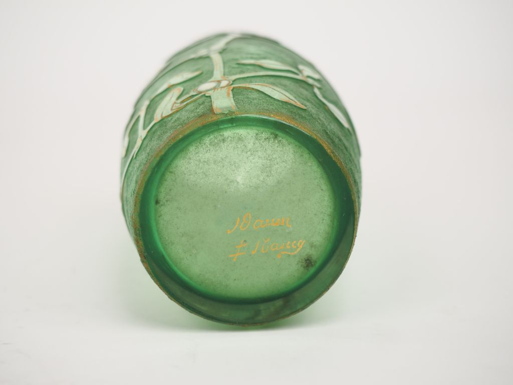 DAUM. Vase en verre givré vert à décor émaillé blanc et doré de guis Signé Daum Nancy. H. 12,5 cm