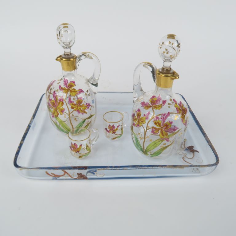 Partie de service à liqueur Art Nouveau en cristal à décor émaillé et doré de fleurs, comprenant 2 flacons et 2 verres à liqueur sur un plateau.