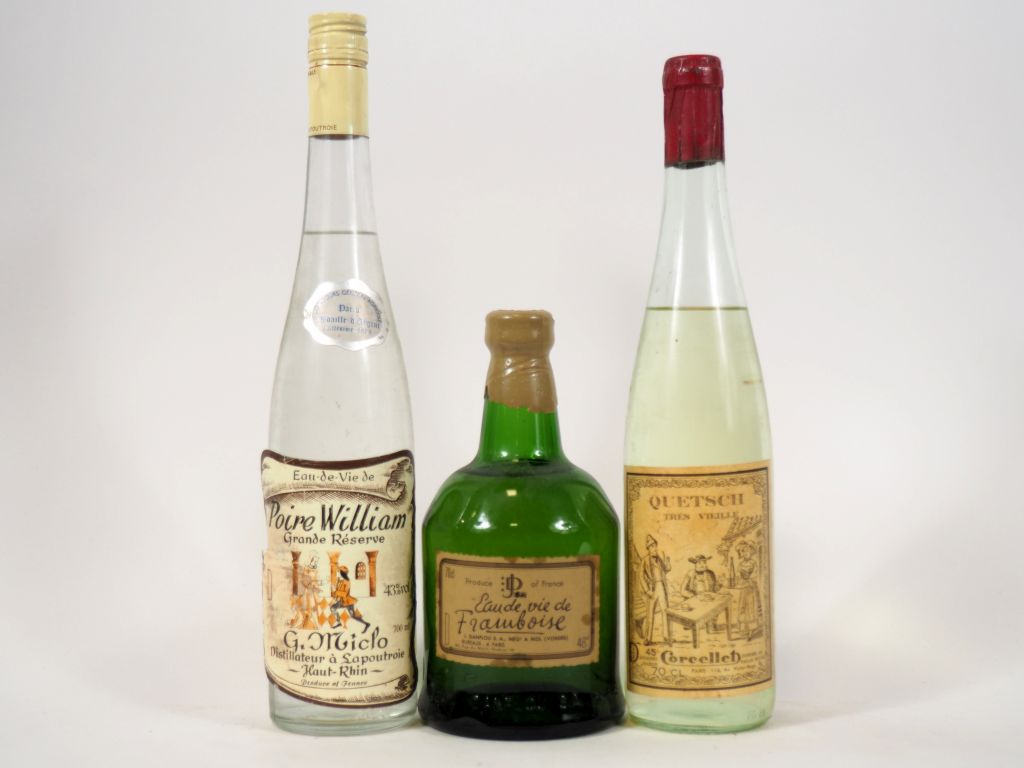 3 BOUTEILLES : 1 EAU DE VIE FRAMBOISE J. DANFLOU 48° - 1 EAU DE VIE POIRE WILLIAMS 'GRANDE RESERVE' G. MICLO 43° - 1 QUETSCH TRÈS VIEILLE CORCELLET 45°
