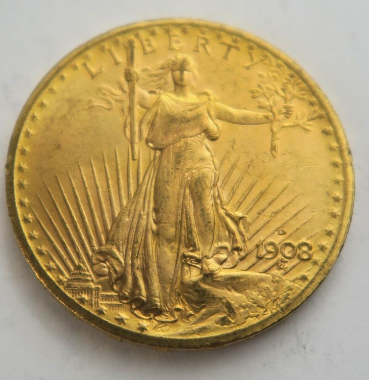 1 pièce de 20 dollars or 1908 D. Frais acheteur 20 % TTC