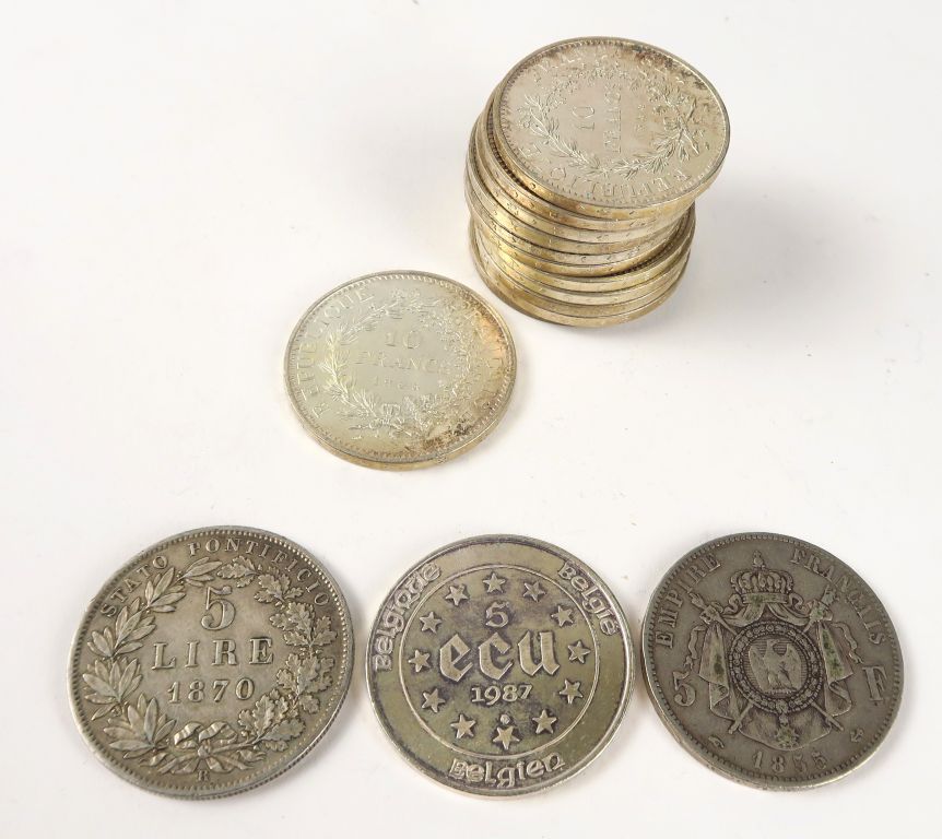 15 pièces d'argent : 12 pièces de 10 francs et 3 pièces : 5 Lire 1870, 5 francs 1855, 1 écu belge 1987