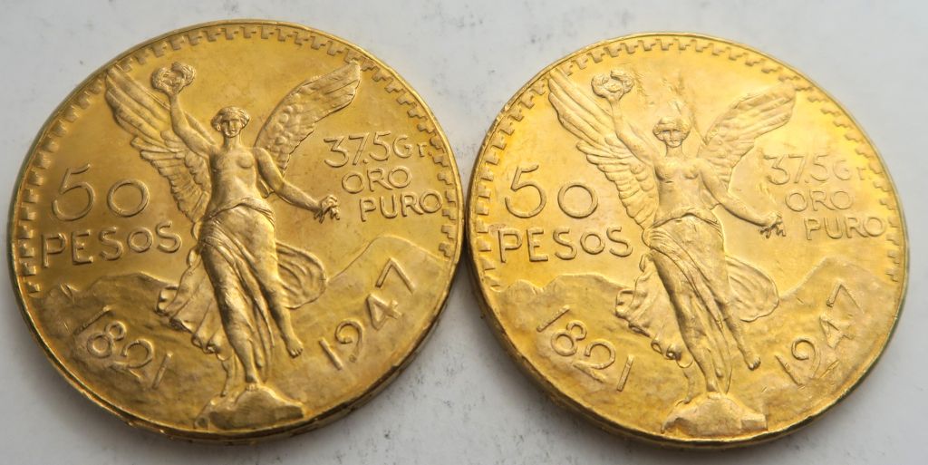 2 pièces de 50 pesos or. Frais acheteur 5 % TTC