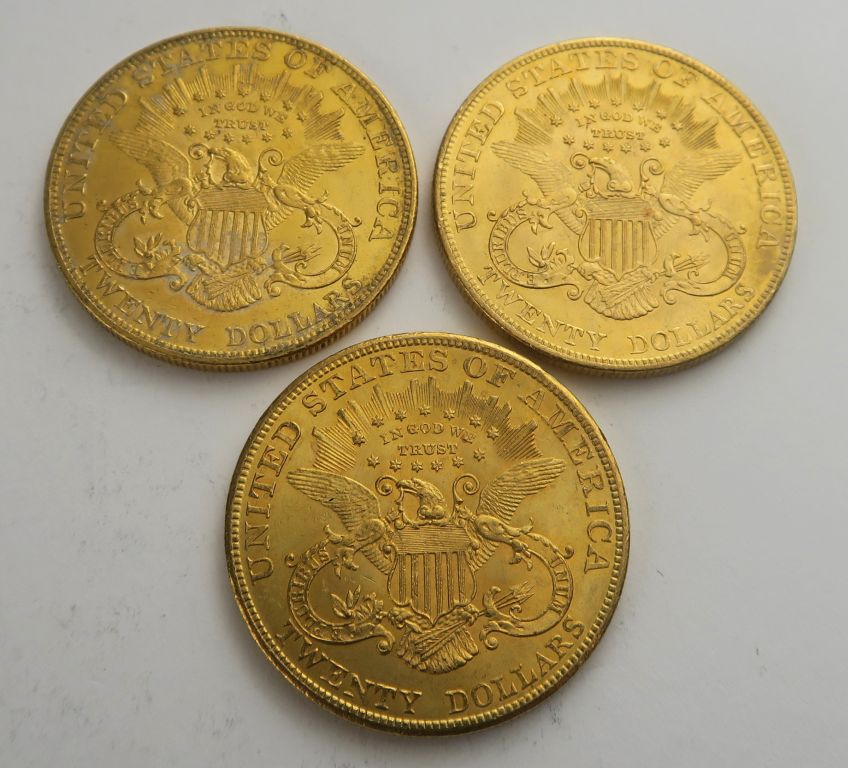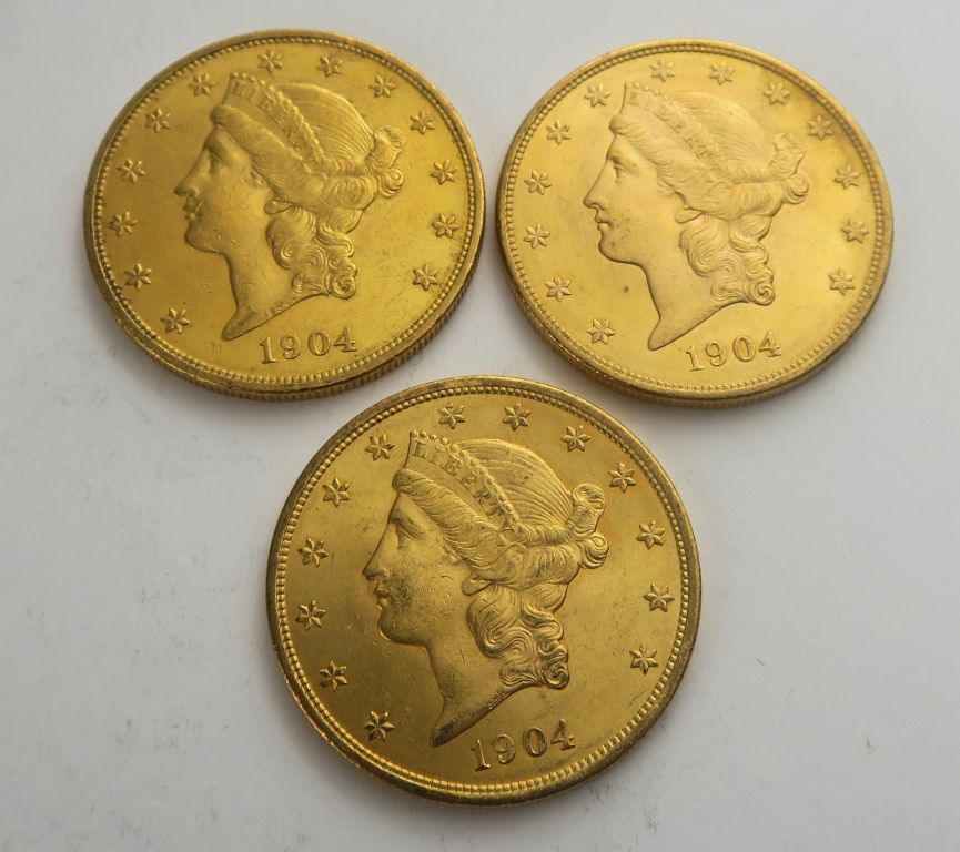 3 pièces de 20 dollars or 1904. Frais acheteur 20 % TTC