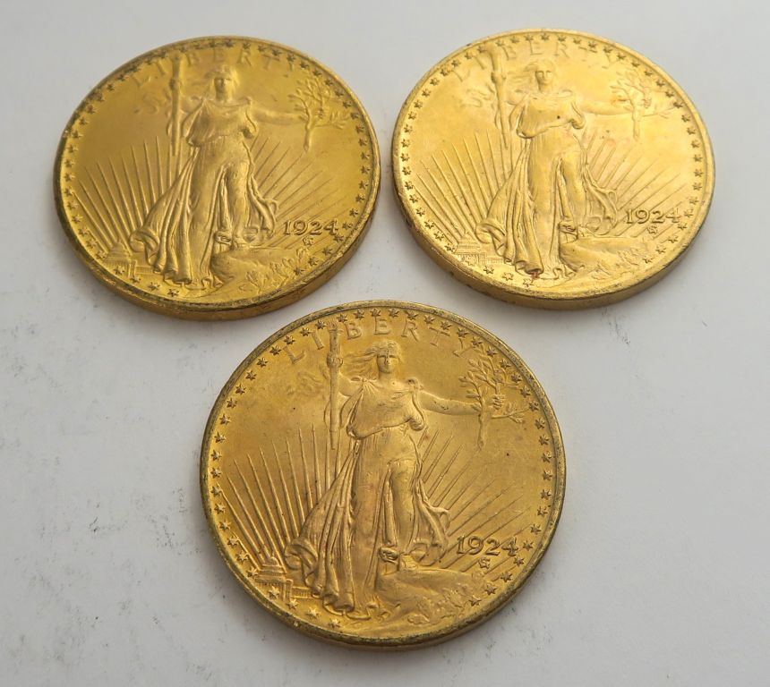 3 pièces de 20 dollars or 1924. Frais acheteur 20 % TTC