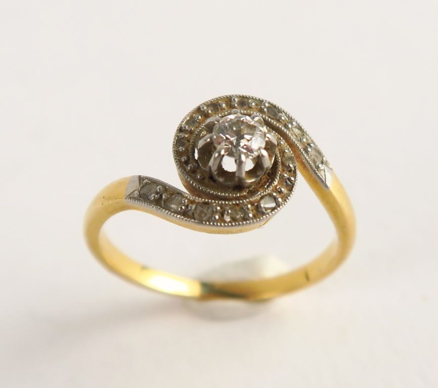 Bague tourbillon, diamant central, entourage de roses. Poids tel : 2,6 g