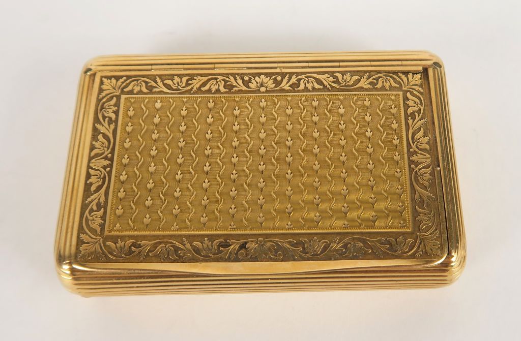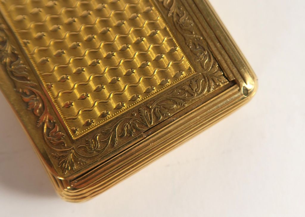 Boite de style Louis XVI en or, à décor de rinceaux feuillagés. Traces de poinçon, petits manques et accidents. Poids : 71 g