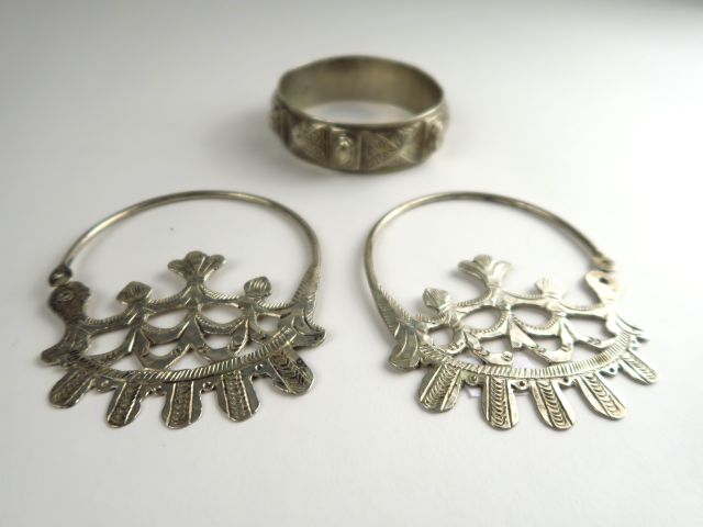 Bracelet berbère et paire de boucles en argent bas titre. Poids : 219 g