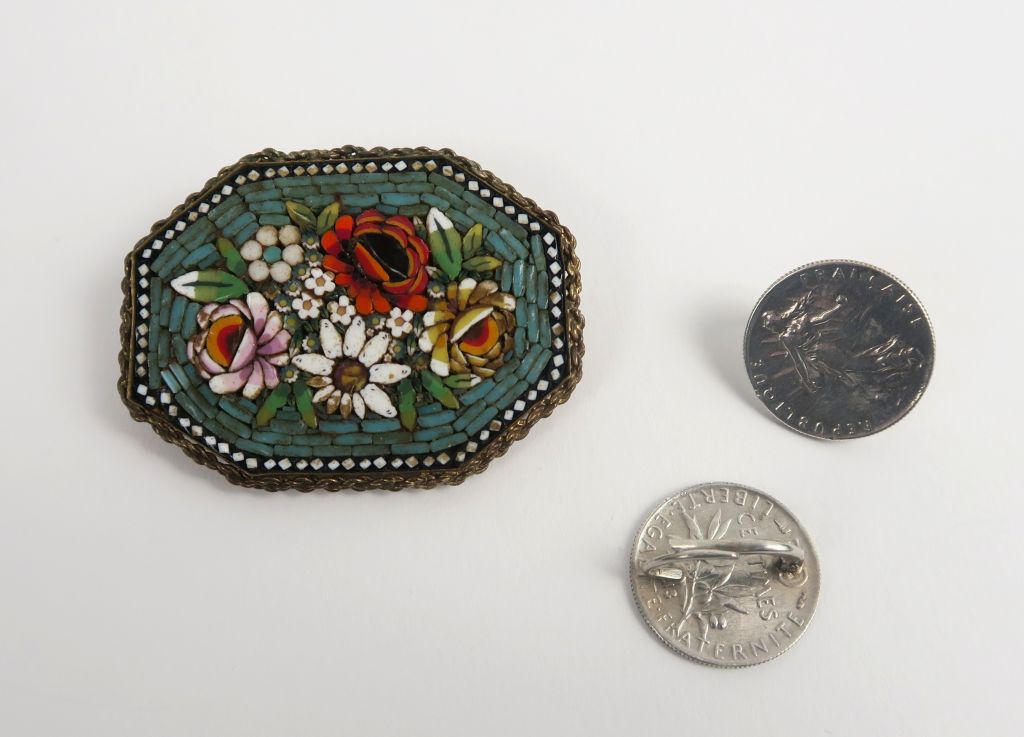 Broche en métal et micro mosaïque à décor de fleurs. Paire de boucles d'oreilles faites à partir de deux pièces de 50 cts de francs