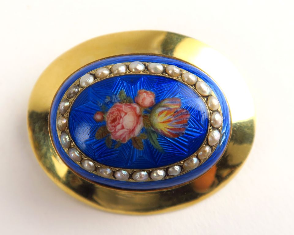 Broche en or, émail polychrome à décor de fleurs sur fond bleu. Dans un entourage de perles baroques. Poids tel : 20,8 g