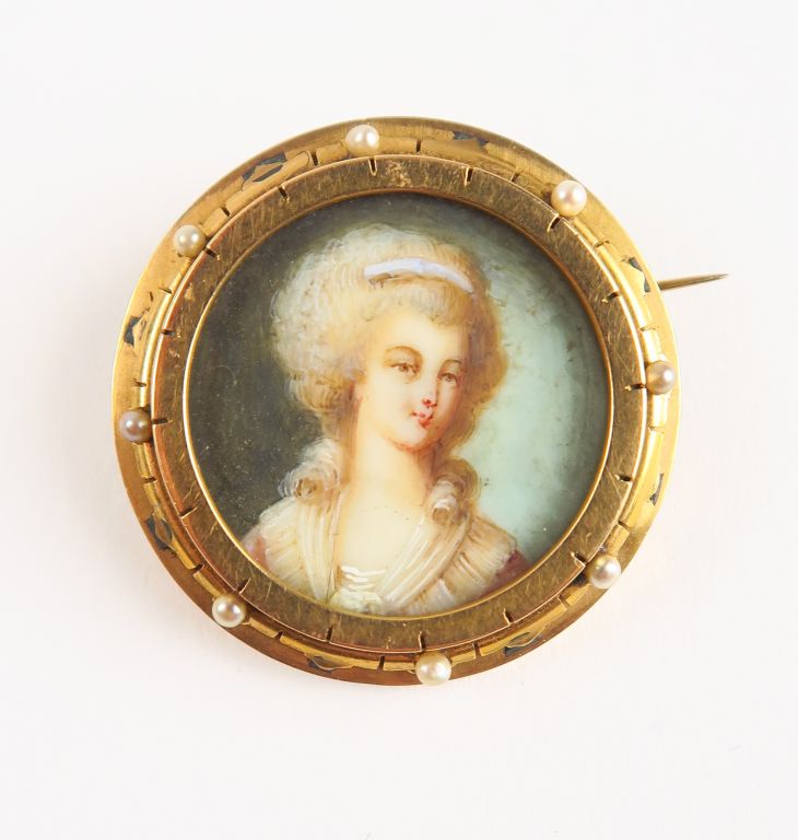 Broche ornée d'une miniature sur ivoire 'Jeune femme', monture en or rehaussée de petites perles. Poids tel : 5,65 g