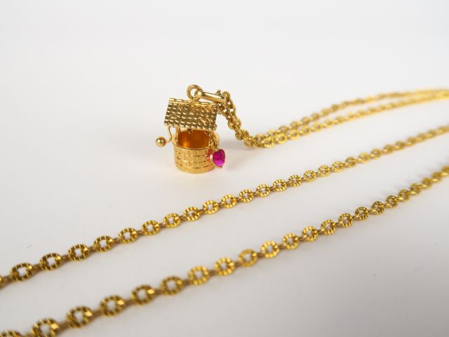 Chaine en or et son pendentif figurant un puits, orné d'une petite pierre rose en forme de cœur. Poids : 12,58 g