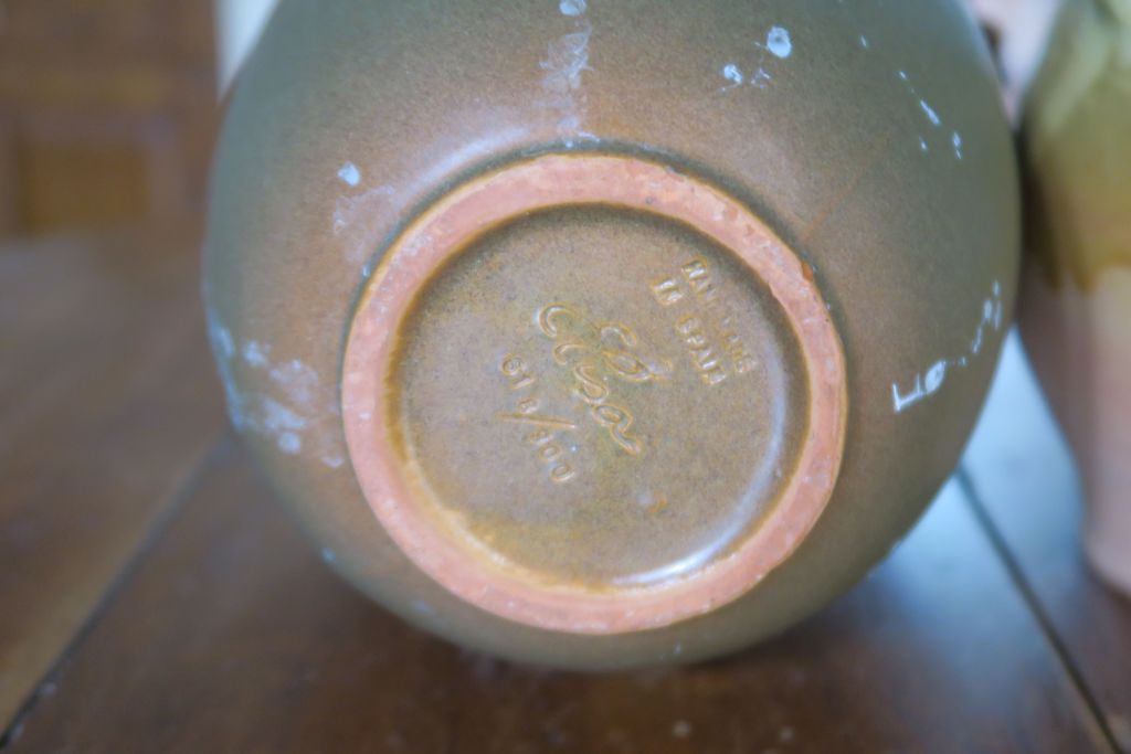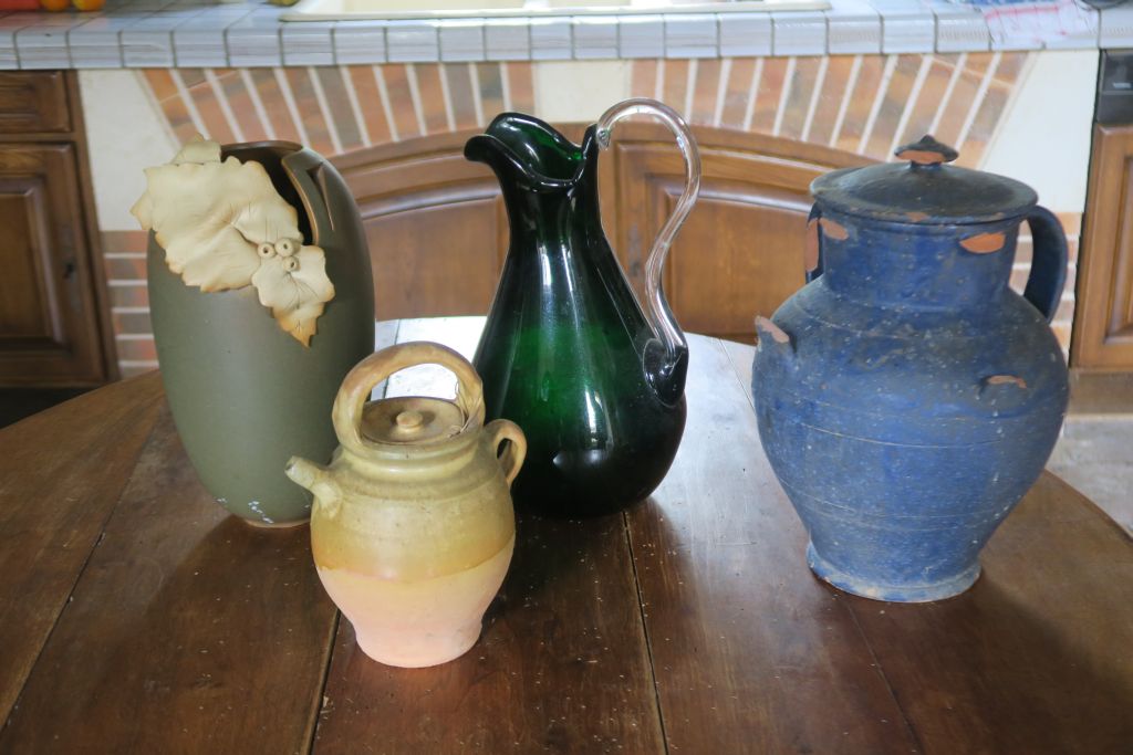 Chevrette en terre vernissée moderne Un pot couvert en terre vernissée bleue (accidents aux anses) Vase en terre vernissée à décor de feuillage en relief signé numéroté 118/900 carafe en verre moulé bicolore soufflé et filé