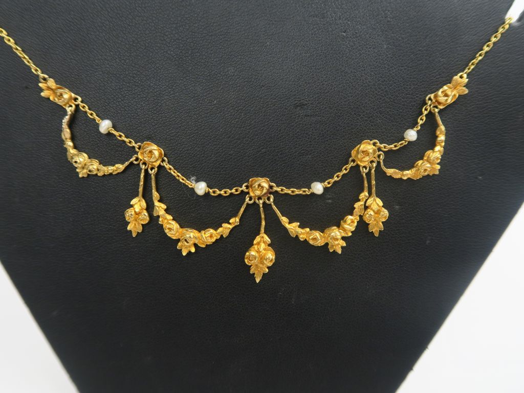 Collier draperie à décor de roses et de perles. Poids tel : 14,7 g