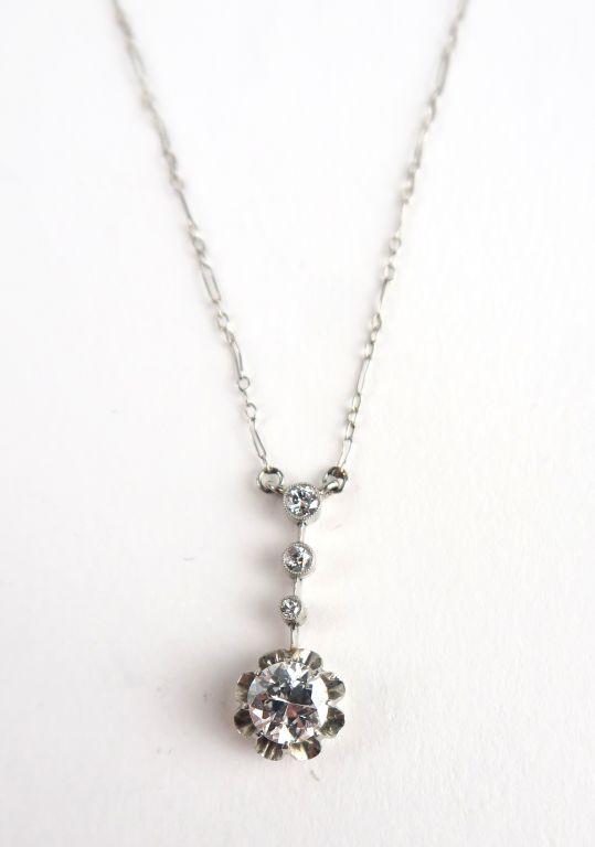 Collier en or blanc, chaine retenant un diamant taille ancienne de 0,60 carat environ et de trois petits diamants sertis clos. Poids tel : 3 g