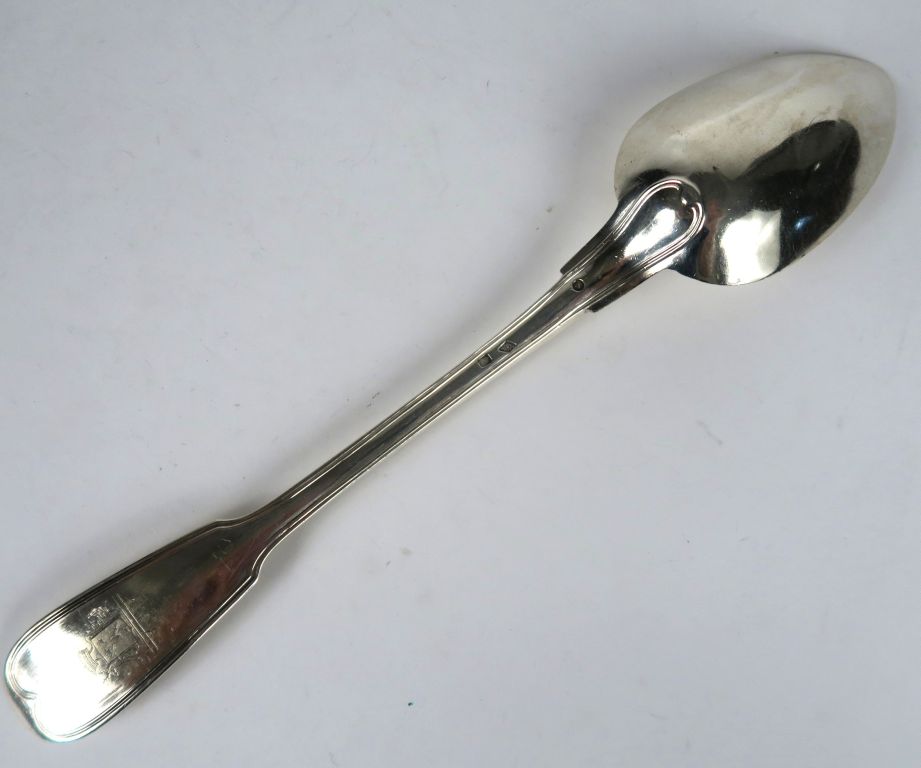 Cuillère à ragout en argent, poinçon Vieillard, modèle au filet, armoriée. Poids : 154 g