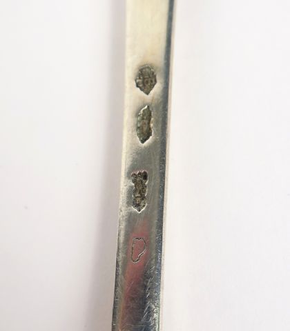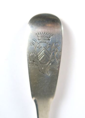 Cuillère à ragout XVIIIe en argent, armoriée. Poids : 178 g