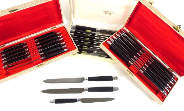 Deux séries de 12 grands couteaux, manche en bois noirci, et 12 couteaux à fromage assortis
