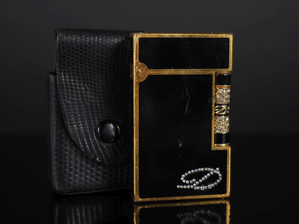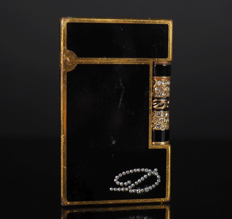 DUPONT. Briquet en laque de Chine, métal doré et pierres fantaisie Signé avec son étui