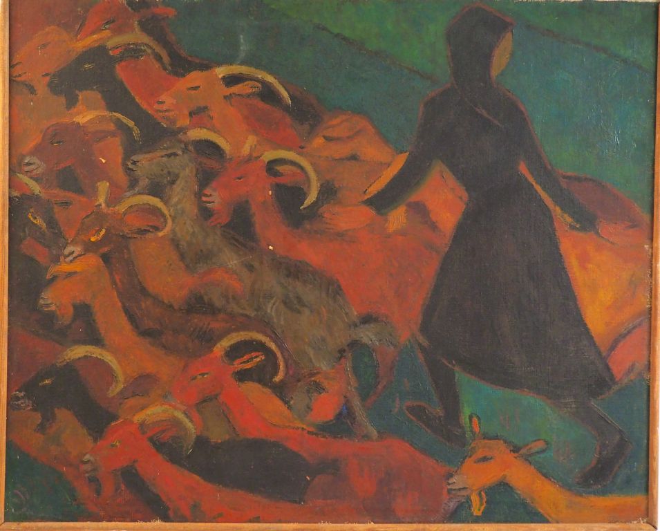 Ecole française XXème. "Bergère et son troupeau de chèvres" Huile sur toile Dim. 80 x 100 cm (petits accidents)