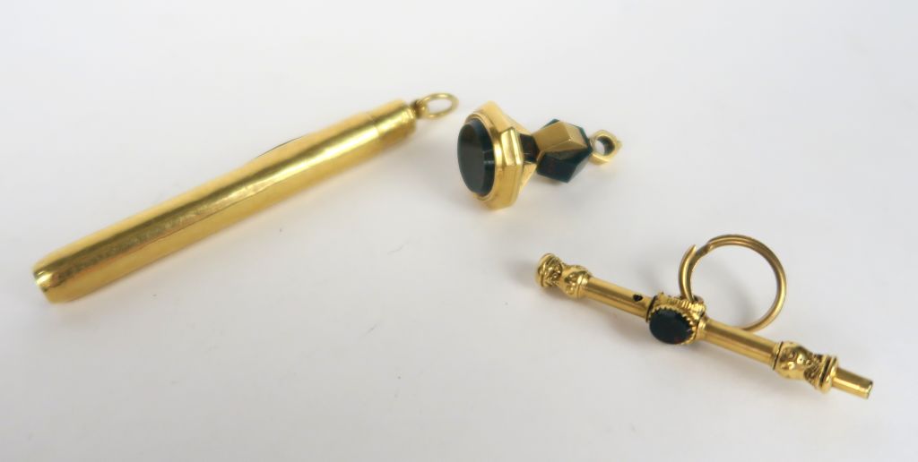 Ensemble comprenant trois éléments de chatelaine : -un cachet et un remontoir de montre en or et jaspe sanguin -une monture de stylo de bal en or. Poids tel : 24,5 g