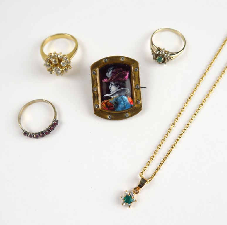 Ensemble de bijoux fantaisie : broche émaillée, trois bagues, collier et pendentif d'imitation