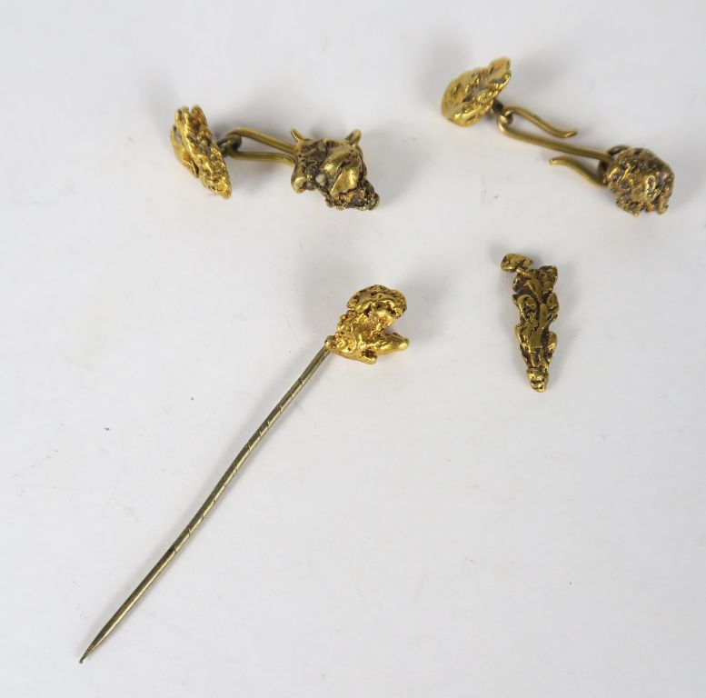 Epingle de cravate en métal doré, ornée d’une pépite d’or On y joint une paire de boutons de manchettes doubles en or et pépite L’ensemble : 21,8 g tel