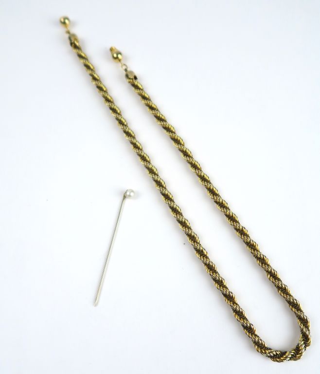 Epingle de cravate en or blanc, ornée d'une perle. Poids tel : 1,25 g. Collier torsadé en métal doré