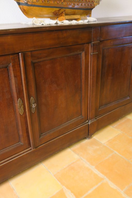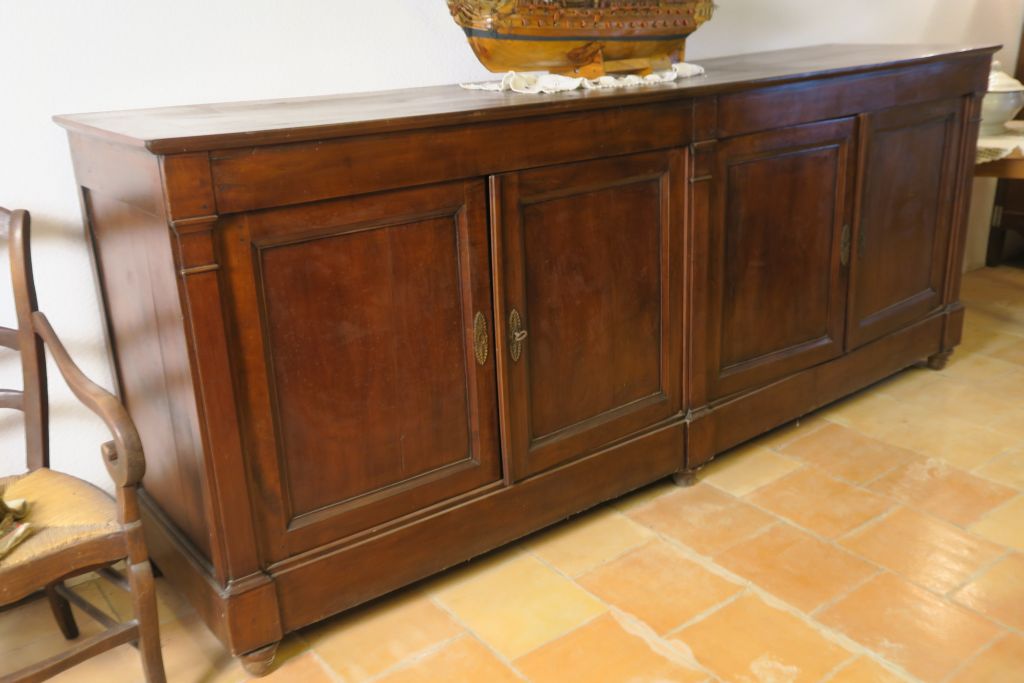 Grande enfilade XIXèmede style Empire en acajou et placage d'acajou ouvrant à quatre vantaux, dessus bois. Dim. 269 x 111 x 64 cm