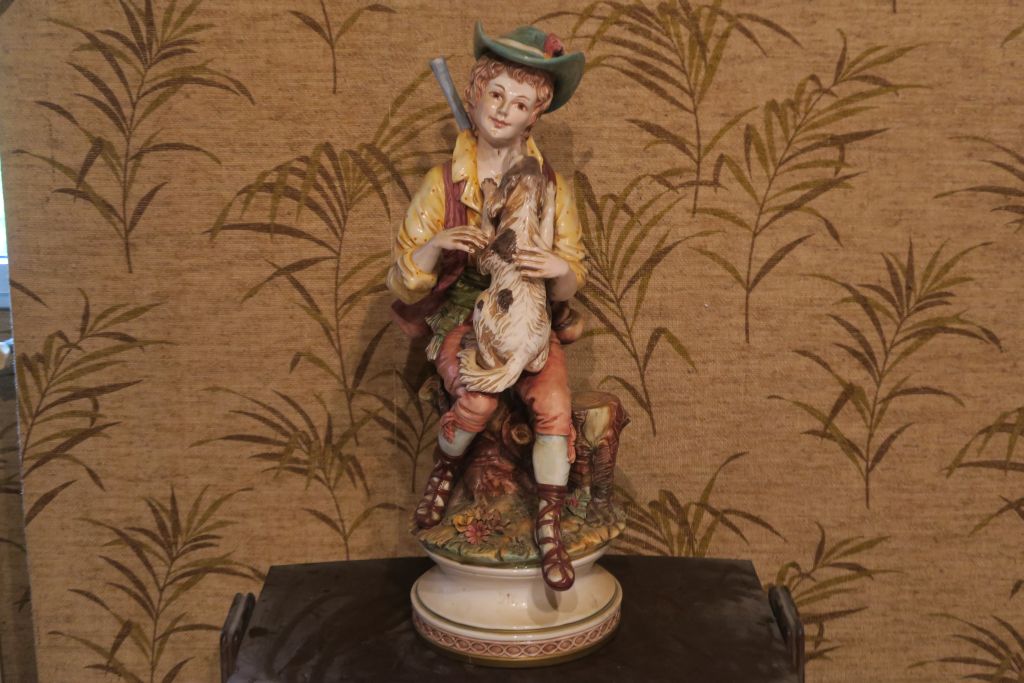 Lot de Grande sculpture en barbotine "jeune chasseur et son chien" H. 69 cm au prix de 40 à 60 € en vente aux enchères par l'hôtel des ventes Primardeco