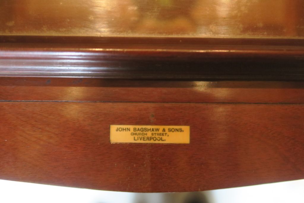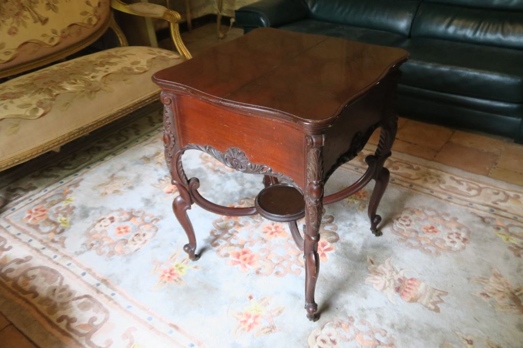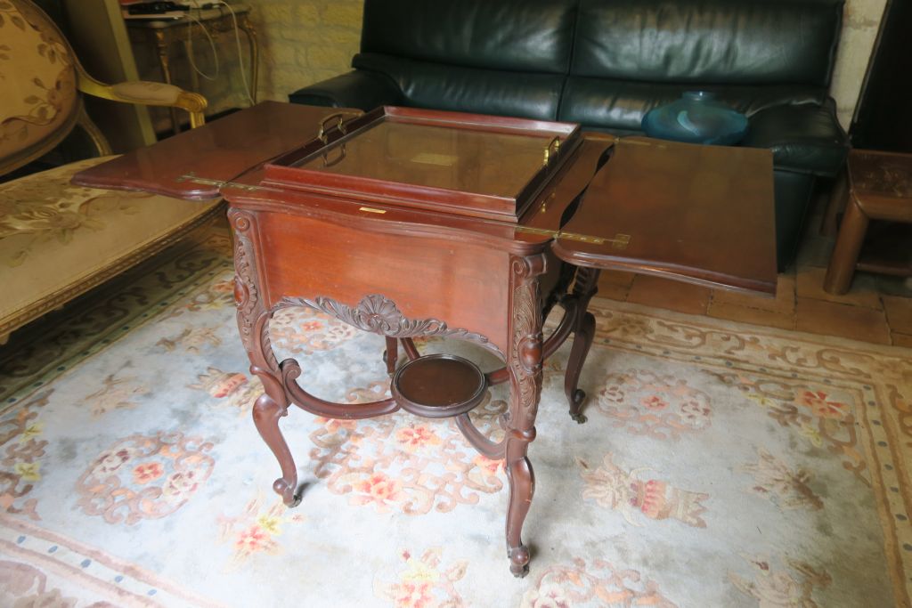 John BAGSHAW AND SOONS . Table à système en acajou et placage d'acajou, à décor de rocaille et de rinceaux feuillagés, ouvrant à deux plateaux découvrant un caisson central. Dim. 80 x 117 x 62.5 cm
