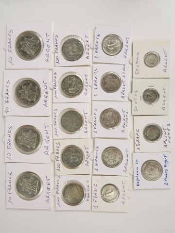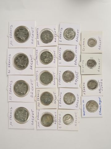 Lot de pièces d'argent comprenenant : 4 pièces 10 francs, 5 pièces de 100 francs, 2 pièces de 2 francs, 2 pièces de 2 francs Céres, 1 pièce de 2 francs NIII, 2 pièces de 1 franc dont 1 Céres, 2 pièces 50 ctms