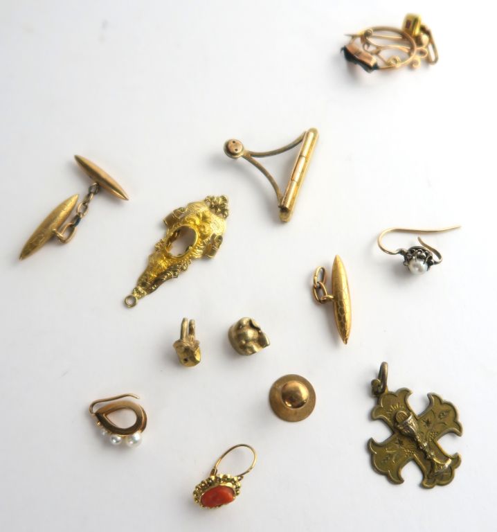 Lot d’or, comprenant des débris de bijoux, des dents, des boucles d’oreilles, boutons de manchette et de col, médaille religieuse. Poids tel : 23.3 g On y joint un lot de débris en or 14 carats. Poids tel : 4.2 g L’ensemble