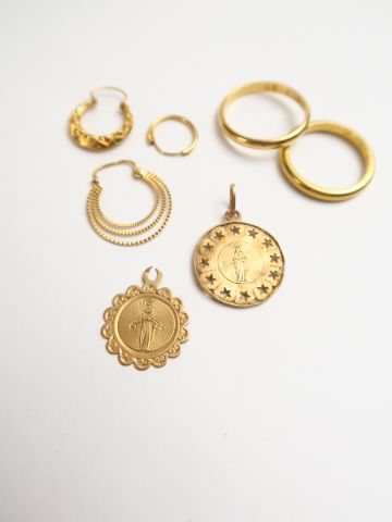 Lot d'or comprenant deux alliances, deux médailles accidentées, trois différents perce-oreilles. Poids : 12,9 g