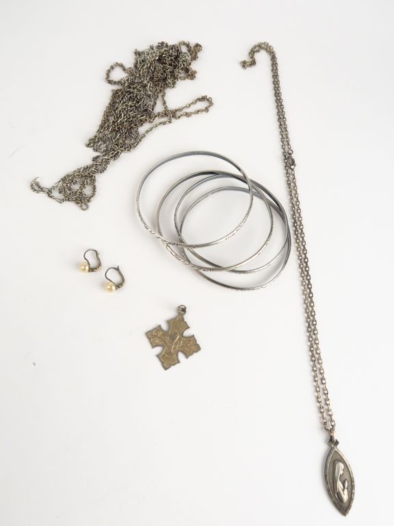 Lot en argent comprenant une médaille, une croix de communion, 5 chaines en argent (accidentées). On y joint quatres jonc en argent gravés (14). Poids : 98,3 g