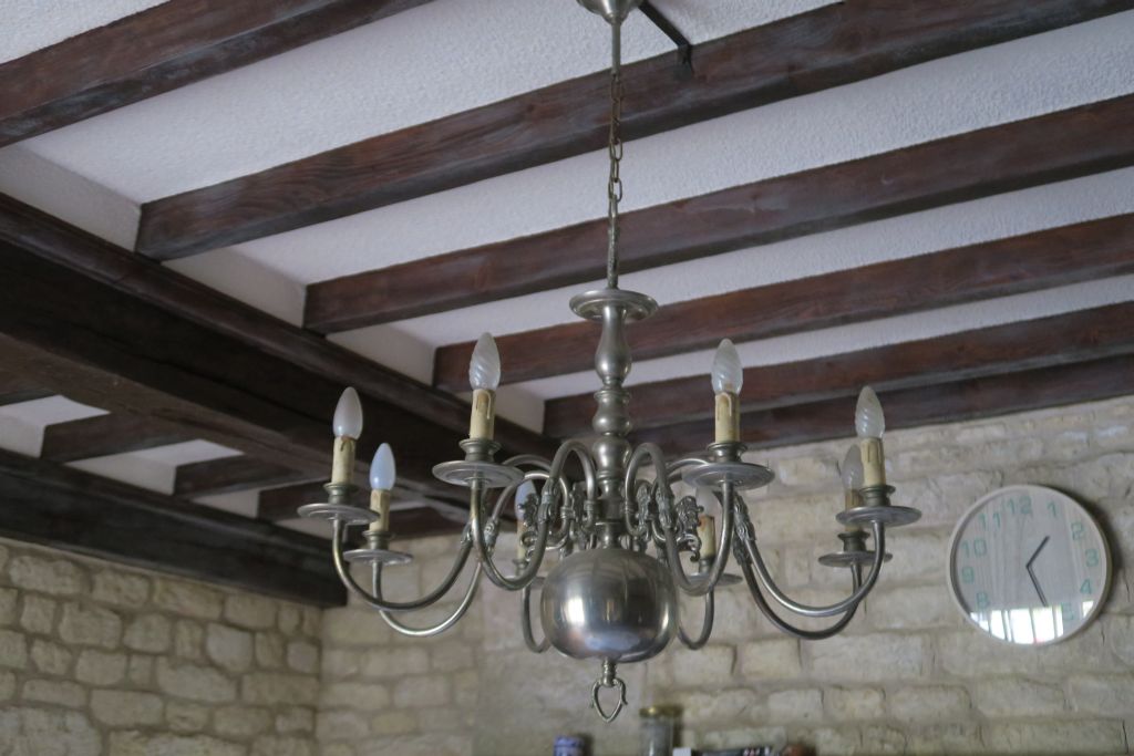 Lustre de style hollandais en métal argenté à décor de bustes de personnages de profil, éclairant à 8 lumières. H. 75 cm.